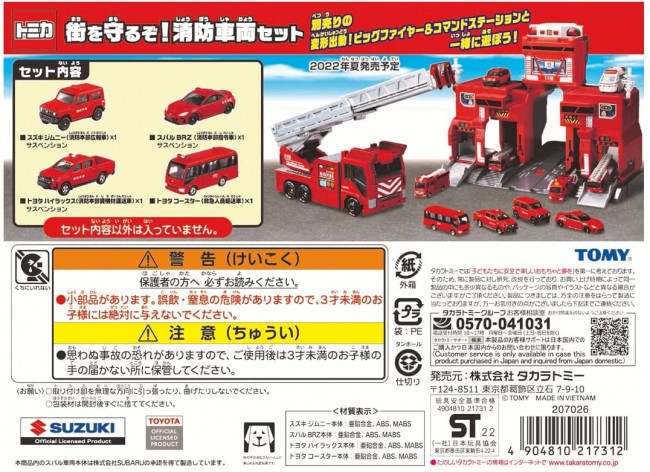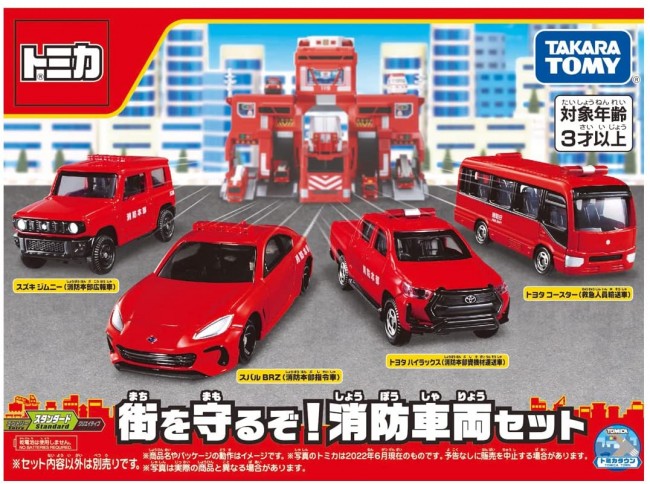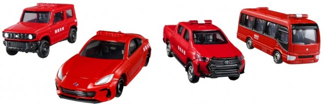 スポーツカーなどの人気車種が消防車両になって4台セットで登場! ●スバル BRZ(消防本部指令車):サスペンション ●スズキ ジムニー(消防本部広報車):サスペンション ●トヨタ ハイラックス(消防本部資機材運送車):サスペンション ●トヨタ コースター(救急人員輸送車) 【セット内容】スバル BRZ(消防本部指令車)(1),スズキ ジムニー(消防本部広報車)(1),トヨタ ハイラックス(消防本部資機材運送車)(1),トヨタ コースター(救急人員輸送車)(1) (c) TOMY