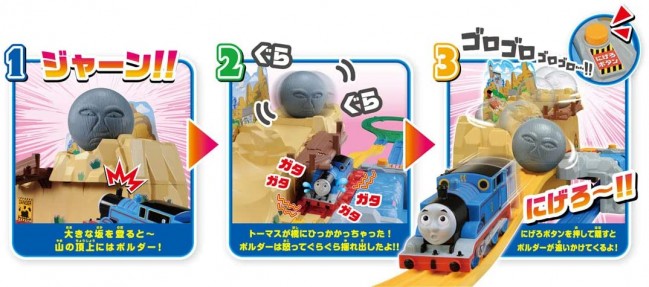 「にげろボタン」を押すとぐらぐら橋にひっかかったトーマスが出発し、「にげろボタン」を指から離すとボルダーが岩山からゴロゴロと転がってトーマスを追いかけてきます。