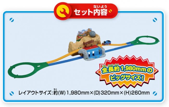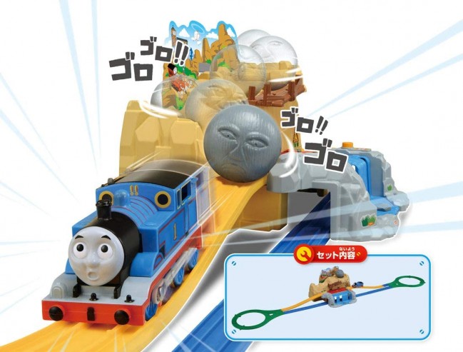 大きな岩山からゴロゴロとボルダーがトーマスを追いかけてくる、ドキドキ!ハラハラ!スリル満点のセットです。