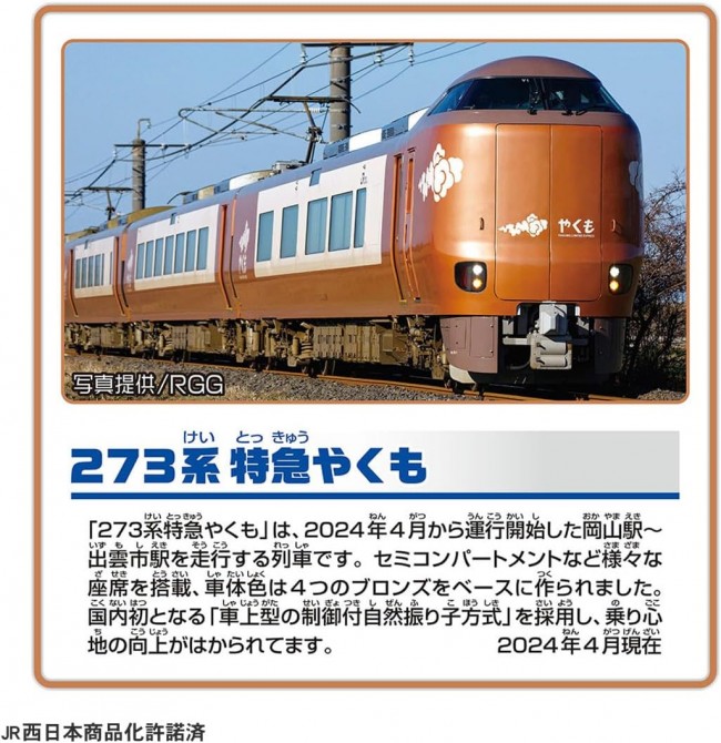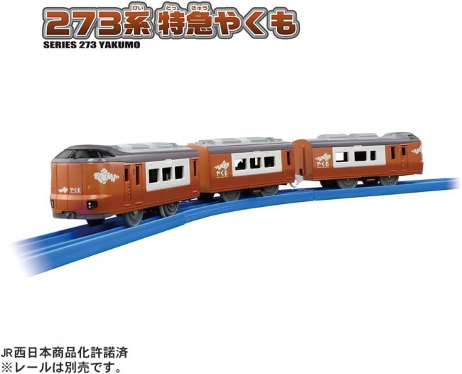 2024年4月から運行を開始した273系特急やくもが登場! セミコンパートメントなど様々な座席を搭載し、車体色は4つのブロンズをベースに作られています。 プラキッズが1体付属し、中間車と後尾車に乗せて遊ぶことができます。 ■「273系特急やくも」がモデル ■3両編成でそれぞれ連結・切り離し可能 ■1スピードで電動走行、スイッチOFFで手転がし遊びが可能 ■プラキッズ1体付 ■中間車と後尾車はプラキッズ乗車遊びが可能 ■プラ列車カード付 ※レールは付属しません。 【セット内容】車両本体(1),プラキッズ(乗客)(1),部品注文書(1),プラ列車カード(1) (C) TOMY JR西日本商品化許諾済 単3形乾電池1本使用(電池は別売です。) ※誤飲防止のため、電池ケース蓋に「ネジ止め式」を採用しています。