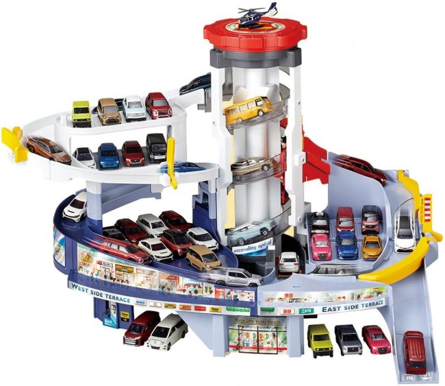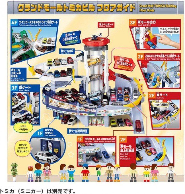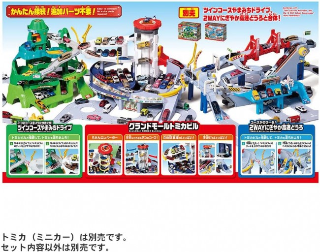 ツインコースやまみちドライブと2WAYにぎやか高速どうろとかんたん合体! トミカの遊びがたくさんつまった大きなグランドモールビル! 55周年特別仕様のシールでリアルなグランドモールを遊びつくそう! トミカがらせんエレベーターを駆けあがって、2つのコースを走りまわります。 らせんエレベーターはまるで自走しているようにリアルにトミカが駆け上がります。 【西モール立体駐車場コース】で立体駐車場に止めたり、【東モール屋上駐車場】で屋上駐車ができます! 55周年限定仕様のショップコラボキラキラシール付きです。 実在するお店のシールを貼ってリアルなモールでトミカを走らせよう! また、別売の「ツインコース やまみちドライブ」「2WAYにぎやか高速どうろ」と追加パーツ不要でかんたん接続! 史上最長!? なが~いドライブコースが完成します!! ※トミカ(ミニカー)は別売です。 【セット内容】屋上ヘリポート(1),エレベーターユニット(1),ベースユニット(1),西モール2階駐車場(1),西モール3階駐車場(1),西モール4階駐車場(1),東モール屋上駐車場(1),スロープA(1),スロープB(1),スロープC(1),柱1(1),柱2(1),柱3(1),柱4(1),柱5(1),柱6(1),西ゲート(1),東ゲート(1),ツインコースやまみちドライブ接続ゲート(1),2WAYにぎやか高速どうろ接続ゲート(1),入口・出口ゲート(1),給油ノズル(1),55周年特別版シール(1),取扱説明書(1) (C) TOMY 単2形アルカリ乾電池2本使用(電池は別売です。) ※電池はアルカリ乾電池をご使用ください。 ※誤飲防止のため、電池ケース蓋に「ネジ止め式」を採用しています。 ※乾電池は、アルカリ/マンガンどちらでも使用できます。
