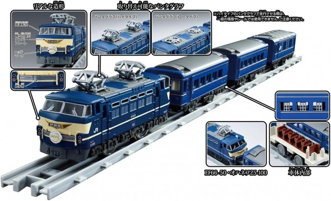 鉄道模型(電動・レール式 等) 細部までこだわった造形・塗装を施した、より”リアル”なプラレール『プラレール リアルクラス』から 『ブルートレインあさかぜ』が登場。 「飾る楽しみ」と「走らせる楽しみ」その両方を目指し、これまでに培った技術やノウハウを結集し、 細部までこだわった、より”リアル”なプラレール、『プラレール リアルクラス』。 今弾は『ブルートレインあさかぜ』が登場。 ■ブルートレインあさかぜがモデル ■4両編成仕様 ■EF66形のナンバープレートは「EF66-50」、メーカーズプレート、パンタグラフなど リアルな造形・塗装などで表現 ■EF66形は飾り帯ヘッドマーク(あり)(なし)を別パーツ化 ■EF66形・オハネフ25-100・カニ24-100は「あさかぜ」ヘッドマーク、トレインマークシール貼り付け済み ■オハネフ25-100・オハネ25-100は2段ベッドシート・はしごパーツを採用 ■カニ24-100は室内エンジンパーツを造形で表現 ■リアル直線レール3本同梱 すぐに飾ることが可能 ■プラレール規格で別売りの通常のレールで拡張可能 商品内容 ブルートレインあさかぜ1編成(4両)(1)、パンタグラフ(ハイタイプ)(2)、パンタグラフ(ロータイプ)(2)、飾り帯ヘッドマーク(あり)(1)、飾り帯ヘッドマーク(なし)(1)、はしご(2)、リアル直線レール(3)、部品注文書(1) (C)TOMY JR東日本商品化許諾済 JR西日本商品化許諾済 (タカラトミー ウェブサイトより)