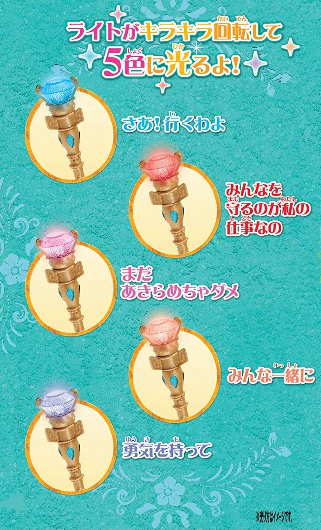 杖を振ったり、ボタンを押す度にエレナのおしゃべりが聞こえます。ボタンを長押しすると『アバローのプリンセス エレナ オープニングテーマ』が流れます。