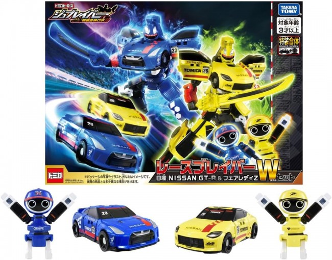 トミカから生まれた新たなヒーロー「トミカヒーローズ ジョブレイバー 特装合体ロボ」から『レースブレイバー 日産 NISSAN GT-R&フェアレディZ Wセット』が登場! アーマートミカ「日産 NISSAN GT-R」がレースジョブロイドと合体し、レーシングカーのジョブレイバ―「レースブレイバー 日産 NISSAN GT-R」になるぞ! さらに、アーマートミカ「日産 フェアレディZ」がレースジョブロイドと合体し、レーシングカーのジョブレイバ―「レースブレイバー 日産 フェアレディZ」になるぞ! 別売りのジョブレイバーたちと一緒に街を守ろう! ・レースジョブロイドはジョブレイバーシリーズの別商品に付属するアーマートミカとも合体可能 【セット内容】アーマートミカ(日産 NISSAN GT-R)上半身パーツ(1),アーマートミカ(日産 NISSAN GT-R)下半身パーツ(右)(1),アーマートミカ(日産 NISSAN GT-R)下半身パーツ(左)(1),レースジョブロイド(Day)(1),武器(V型六鬼刀-炎神-)(1),アーマートミカ(日産 フェアレディZ)上半身パーツ(1),アーマートミカ(日産 フェアレディZ)下半身パーツ(右)(1),アーマートミカ(日産 フェアレディZ)下半身パーツ(左)(1),レースジョブロイド(Birth)(1),武器(V型六鬼刀-焔刃-)(1),武器装着パーツ(2),ラベル(1),取扱説明書(1) (C) TOMY