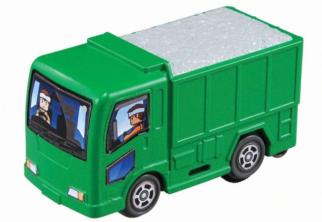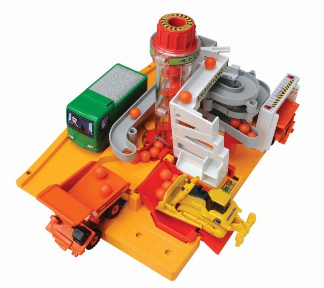 トラックの動力で土砂玉をくみ上げ、建設車両のトミカと遊べる工事現場です。