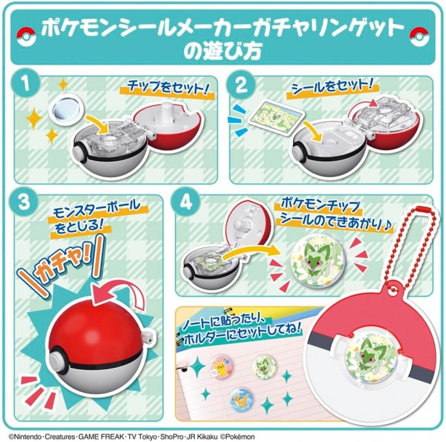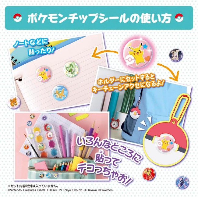 モンスターボールを閉じるとポケモンのチップシールがつくれちゃう! ポケモンのシールメーカーが登場! ポケモンをゲットするみたいに、モンスターボールを閉じる動作でチップシールがつくれちゃう! つくれるチップシールは全部で40個!(チップシールのサイズは直径約17mm) ■ポケモンチップシール作り方 (1)チップとシールを本体にセットしよう (2)モンスターボールをガチャッと音がするまで閉じよう (3)モンスターボールを開くとチップシールのできあがり できたチップシールはノートやケースなど好きなところに貼ったり、 付属のホルダーにセットするとキーチェーンアクセになるよ! カバンにつけてポケモンとお出かけしよう! 【セット内容】本体(1),チップ(40),シールシート(3),ホルダー(3),ボールチェーン(3),つくりかた説明書(1) (C)Nintendo・Creatures・GAME FREAK・TV Tokyo・ShoPro・JR Kikaku (C)Pokemon