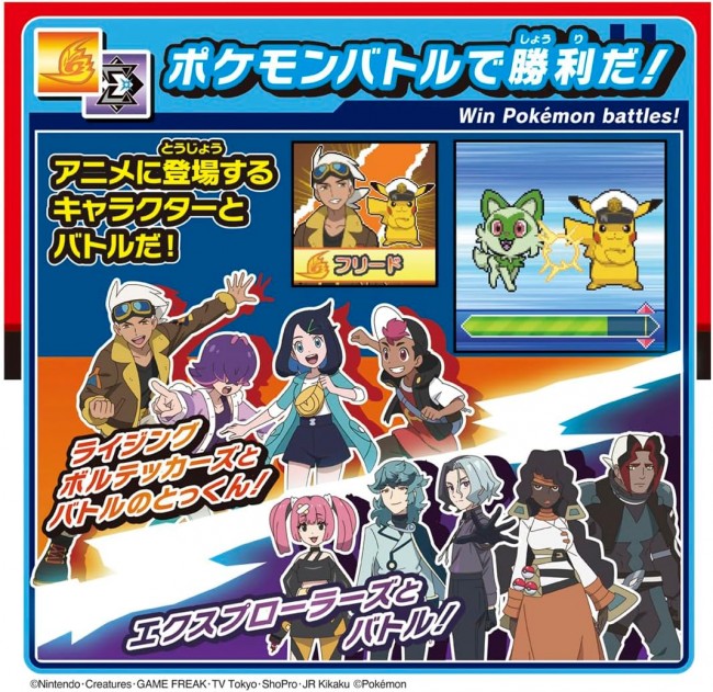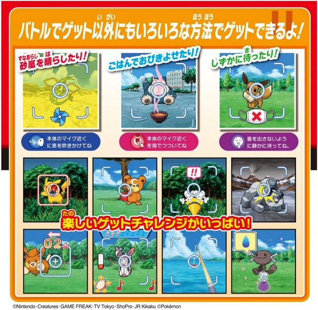 熱い体感バトルでポケモンゲット! モンスターボール型の液晶トイが登場! 連打で熱いポケモンバトル!タイミングよくモンスターボールを閉じてゲット! 出会ったポケモンを集めて、ポケモンリストのコンプリートを目指そう! 伝説・幻のポケモンなど300以上登場! さあ、冒険に出発!ルーレットで行き先が決定! ゲットチャレンジやバトルなど、止まったマスでいろんなイベントが起きるよ! 〇タイプマス、伝説・幻マス ここのマスに止まるとポケモンが出現! 「バトルでゲット」 相手の攻撃に負けないように本体を「トントン」連打してゲージを増やそう! ゲージがゲット枠まできたら、タイミングよくモンスターボールを閉じてポケモンゲットだ! あいぼうの「ひっさつわざ」発動で、バトルを有利に進められるぞ! 他にも「大声を出してゲット」「追いかけてゲット」「リズムに乗ってゲット」など楽しいゲットチャレンジがいっぱい! ゲットしたポケモンは「あいぼう」にしよう! 〇ライジングボルテッカーズマス/エクスプローラーズマス アニメに登場するキャラクターがポケモンを出してくるぞ! ライジングボルテッカーズとはバトルの特訓、エクスプローラーズとはポケモンバトルだ! 「あいぼう」と一緒に勝利を目指せ! 〇なかよしマス あいぼうをお手入れしてあげたり、きのみをあげたり、ボールで遊んだり3つの遊びができるよ! うまくできるとあいぼうの「なかよしど」がアップ! 「なかよしど」が上がるとバトルで「ひっさつわざ」が出やすくなるよ! 【セット内容】本体(1),取扱説明書(1) (C)Nintendo・Creatures・GAME FREAK・TV Tokyo・ShoPro・JR Kikaku (C)Pokemon 単4形アルカリ乾電池3本使用(電池は別売です。) ※電池はアルカリ乾電池をご使用ください。 ※誤飲防止のため、電池ケース蓋に「ネジ止め式」を採用しています。