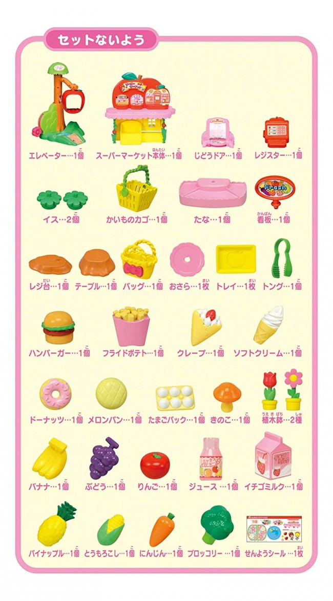 スーパーマーケット本体(1),エレベーター一式(1),じどうドア(1),レジスター(1),レジ台(1),おかいものカゴ(1),たな看板&看板(1),
