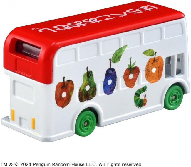 コレクショントイ( 乗用車・完成品 ) ドリームトミカに「はらぺこあおむし」のラッピングバスが登場! 絵本の表紙や、印象的なシーンを両面にラッピングしたバスです。 今絵本を読んでいる人も、昔読んでいた人も 「はらぺこあおむし」の世界を楽しめる一台です。 パッケージサイズ: W78×H41×D39mm 対象年齢: 3歳~ 商品内容 本体(1) (C)TOMY (C) 2024 Penguin Random House LLC. ERIC CARLE, THE VERY HUNGRY CATERPILLAR, THE WORLD OF ERIC CARLE logo, the Caterpillar logo and related designs, logos, and names are trademarks and/or registered trademarks of Penguin Random House LLC. All rights reserved. &wquot;The Very Hungry Caterpillar” is published by Penguin Random House LLC. (タカラトミーモールウェブサイトより)