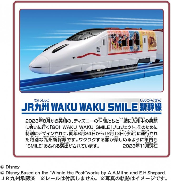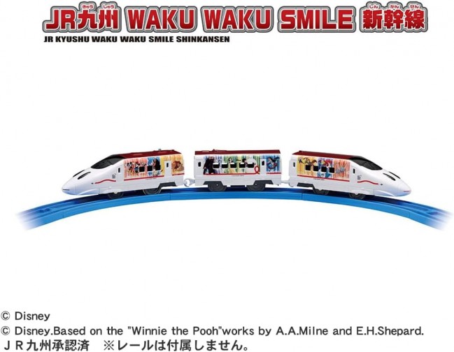 鉄道模型(電動・レール式 等) JR九州で実施されたディズニーの仲間たちと一緒に九州中の笑顔に会いに行く「GO! WAKU WAKU SMILE」プロジェクト。 そのために特別にデザインされて運行した九州新幹線がプラレールに登場です。 ■「JR九州 WAKU WAKU SMILE 新幹線」がモデル ■3両編成でそれぞれ連結・切り離し可能 ■2スピードで電動走行、スイッチOFFで手転がし遊びが可能 ■プラ列車カード付 ※レールは付属しません。 商品内容 車両本体(1)、プラ列車カード(1)、部品注文書(1) 電池 : 単3形アルカリ乾電池×1(別売) (C) TOMY (C) Disney (C) Disney.Based on the "Winnie the Pooh"works by A.A.Milne and E.H.Shepard. JR九州承認済