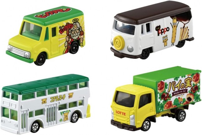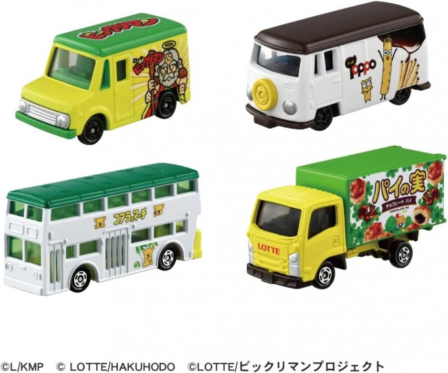コレクショントイ( 乗用車・完成品 ) トミカギフトセットからロッテの人気お菓子とのコラボ商品が登場! [セット内容](アクション) ・ビックリマンチョコ(サスペンション) ・トッポ(サスペンション) ・コアラのマーチ(サスペンション) ・パイの実(サスペンション/パネル開閉) 商品内容 ビックリマンチョコ(トミカ)(1)、トッポ(トミカ)(1)、コアラのマーチ(トミカ)(1)、パイの実(トミカ)(1) (C)TOMY (C)L/KMP (C)LOTTE/HAKUHODO (C)LOTTE/ビックリマンプロジェクト (タカラトミー ウェブサイトより)