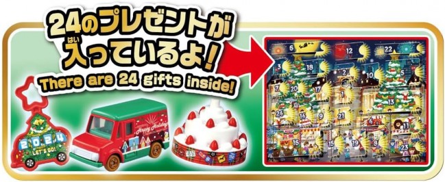 コレクショントイ( 乗用車・完成品 ) 24のカレンダーを1日ごとに開けよう! 2024年はクリスマスマーケットがテーマのトミカ アドベントカレンダーが登場! スぺシャルトミカ クリスマスラッピングカー付き! 2024年限定生産 箱本体の24のカレンダーにクリスマスムードを引き立てるプレゼントが入っています。 どこに何が入っているかは開けてからのお楽しみ! 箱の前面を開くとクリスマスマーケットがテーマのプレイマップが広がります。 1日ごとに開けて、全部そろうと楽しいトミカタウンが完成します。 情景や小物パーツは別売りのトミカタウンと一緒に遊べます。 スペシャルトミカ クリスマスラッピングカー付き。 (2024年限定生産商品です) ※スペシャルトミカ以外のトミカは別売りです。 商品内容 スペシャルトミカ クリスマスラッピングカー(1)、人形(サンタクロース)(1)、トナカイ(1)、ソリ(1)、人形(グリーン)(1)、人形(パープル)(1)、人形(ミセスクロース)(1)、ケーキ(1)、ツリー型バス停看板(1)、飛び出し人形看板(1)、自転車(1)、ミニパッケージ(4)、ゲート看板A(1)、ゲート看板B(1)、経路案内標識(1)、立ち木(2)、ツリー型ゲート柱(2)、ミニトミカ(1)、トンネル(1)、ベンチ(1)、自動販売機(2)、プレゼント(1)、ポスト(1)、信号機(2)、標識(2) (C)TOMY (タカラトミー ウェブサイトより)