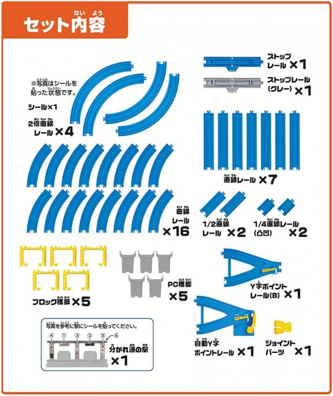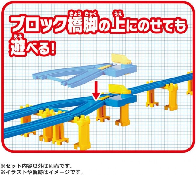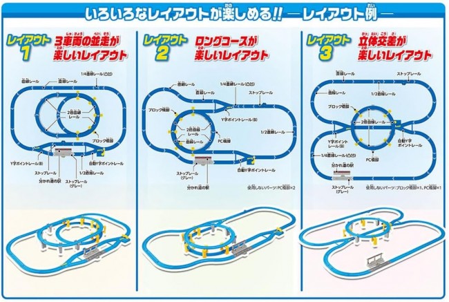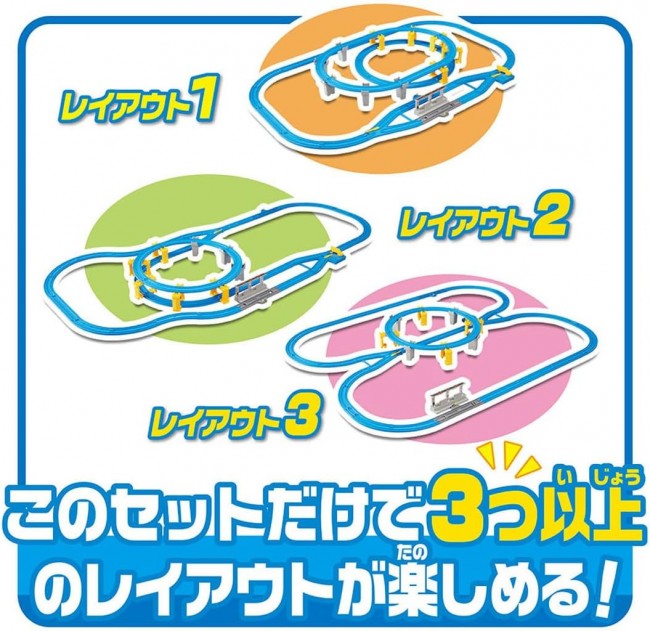 通過するたびにポイントが左右に切りかわる自動Y字ポイントレールが入ったレールキット! このキットだけで3つ以上のレイアウトが楽しめて、かっこいい立体交差もできる! 別売の「レバーでアクション&サウンド!ビッグステーション」と組み合わせるとさらに楽しい! 自動Y字ポイントレールは、車両が通過するたびにポイントが切りかわり、自動で左右交互へ進路を変えることができます。 ■3編成の並走レイアウトや、ロングコースレイアウト、立体交差レイアウトなどこのキットだけで3つ以上のレイアウトが楽しめます。 ■別売の「レバーでアクション&サウンド!ビッグステーション」と組み合わせると、車両のホームへの進入を自動で交互に切りかえて遊ぶことができます。 ■自動Y字ポイントレールはブロック橋脚の上にのせて遊ぶことができます。 ■全部で46個のレールや情景が入っています。 ※自動Y字ポイントレールの上にはブロック橋脚をのせる事はできません。 ※車両の編成やレイアウトによっては、正常に走行できない場合があります。 【セット内容】直線レール(7),1/2直線レール(2),1/4直線レール(凸凹)(2),曲線レール(16),Y字ポイントレール(B)(1),2倍曲線レール(4),ストップレール(1),ストップレール(グレー)(1),自動Y字ポイントレール(1),ジョイントパーツ(1),ブロック橋脚(5),PC橋脚(5),分かれ道の駅(1),ラベル(1) (C) TOMY