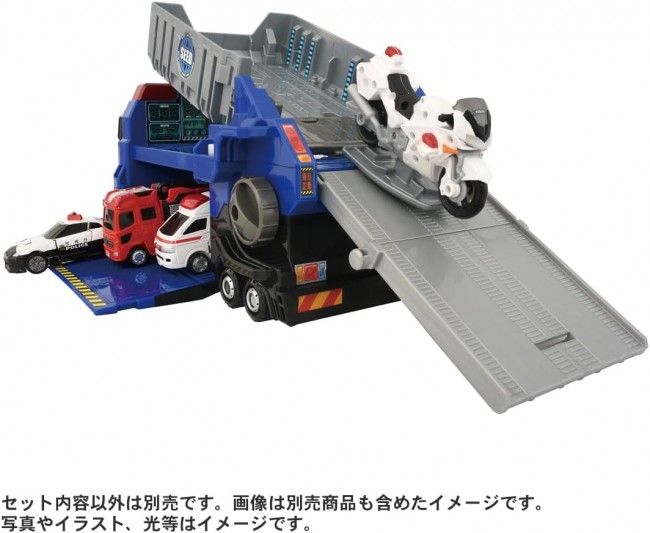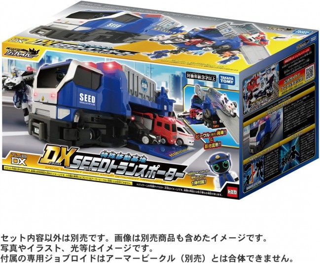 7月6日より始まる「特装合体ロボ ジョブレイバー」から『SEEDトランスポーター』が登場! ジョブレイバーで思いっきり遊べるビッグビークルが登場! トミカ ジョブレイバー TJBDX 特殊移動基地 DX SEEDトランスポーター4大ポイント (1)ジョブレイバー&ユナイトビークル出動! ハンドルを回してデッキを上昇させればジョブレイバーやユナイトビークルを出動させられるぞ! (2)基地モードにチェンジ! スタンドを倒した状態でハンドルを回すとデッキが展開できるぞ! さらにヘリポートやサイドガレージを展開することで別売のユナイトビークルを出動させられるぞ! (3)タイホールド発射! 犯人を逮捕! 前部にあるボタンを押せばタイホールド発射! 障害物にぶつかればアームは展開し、すぐさま犯人を逮捕できるぞ! (4)ジョブロイドがコックピットに搭乗できるぞ! コックピットの窓を開くことでジョブロイドたちが搭乗できるぞ! 好きなジョブロイドでSEEDトランスポーターを運転しよう! ジョブレイバーたちと一緒にDX SEEDトランスポーターを遊びつくそう! SEEDトランスポーター専用ジョブロイドとバイク発車用パーツが付属します。 【セット内容】SEEDトランスポーター本体(1),タイホールド(1),アーム(左)(1),アーム(右)(1),スロープ(1),警察ジョブロイド(1),バイク発車用パーツ(1),シール(1) (C) TOMY