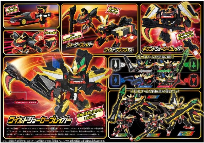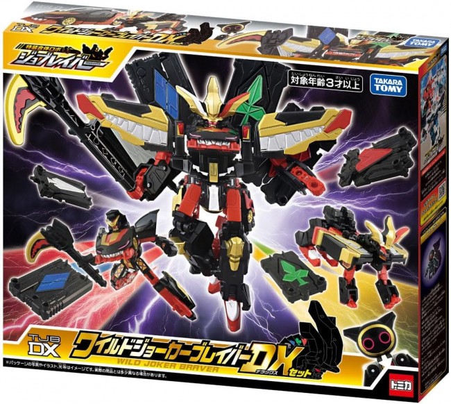 「特装合体ロボ ジョブレイバー」から『ワイルドジョーカーブレイバー』が登場! 「ギガントジョーカーブレイバー」がトランプ型武器(スペード/ダイヤ/クラブ/ハート)を身に着けることでさらにパワーアップ!!「ワイルドジョーカーブレイバー」になるぞ!! ●ジョブロイド「ジョーカー」と「ジョーカービークル」が特装合体して「ジョーカーブレイバー」になるぞ! ●ジョーカーブレイバーとバディロイド「ワイルドワンワンマル」が超特装合体して「ギガントジョーカーブレイバー」になるぞ! ・武器パーツが付属します。 【セット内容】アーマービークル(ジョーカービークル)上半身パーツ(1),アーマービークル(ジョーカービークル)下半身パーツ(右)(1),アーマービークル(ジョーカービークル)下半身パーツ(左)(1),ジョブロイド ジョーカー(1),鎌型武器(1),バディロイド(ワイルドワンワンマル)本体(1),バディロイド(ワイルドワンワンマル)頭パーツ(1),バディロイド(ワイルドワンワンマル)肩アーマーA(1),バディロイド(ワイルドワンワンマル)肩アーマーB(1),ワイルドバイザー(1),トランプ型武器(スペード)(1),トランプ型武器(ダイヤ)(1),トランプ型武器(ハート)(1),トランプ型武器(クラブ)(1),ジョイントパーツ(1),シール(1),取扱説明書(1) (C) TOMY