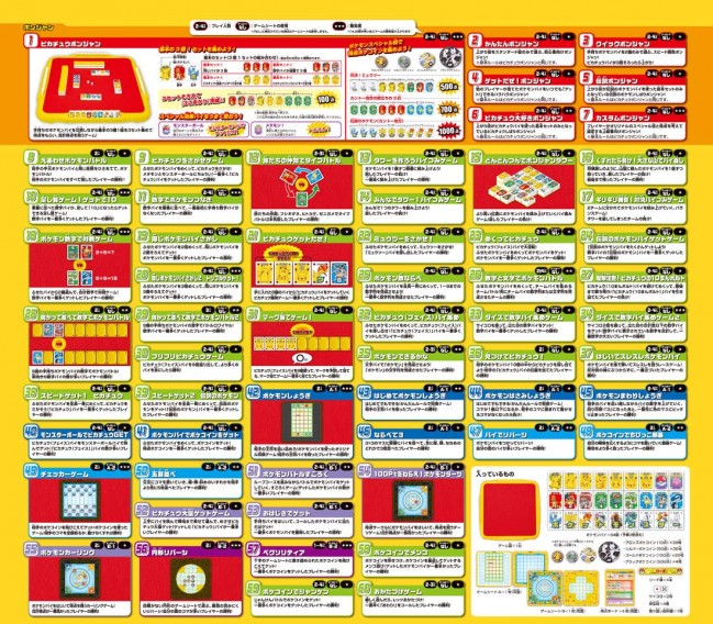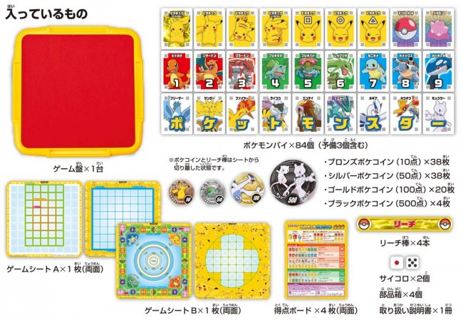 ゲーム盤(1)、ポケモンパイ(84)、得点ボード(4)、ゲームシートA(1)、ゲームシートB(1)、サイコロ(2)、部品箱(4)、取り扱い説明書(1)、ブロンズポケコイン(10点)(38)、シルバーポケコイン(50点)(38)、ゴールドポケコイン(100点)(20)、ブラックポケコイン(500点)(4)、リーチ棒(4)