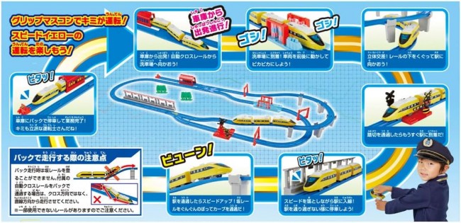 加速・減速、停車・バック、6段階のスピード調整! グリップマスコンでスピードイエローを自在にコントロール! コントロールあそびがより楽しくなる、大きなレイアウト付き! プラレール鉄道のスピードイエローをグリップマスコンで簡単操作、自在にコントロール! 加速・減速、停車・バックなどリアルな走行を楽しもう!! ■スピードイエロー車両(グリップマスコンIRシャーシ)、特別カラーのグリップマスコン付属 ■特別カラーの車庫や洗車場などコントロールあそびがより楽しくなるレール部品&情景部品付属 ■好きなプラレール車両(別売)にのせかえ可能 ※一部車両を除く ■グリップマスコンシリーズの車両が2台あればAとBのバンド切り替えで別々に走行させることが可能 ※セット内容に車両は1編成のみ付属します。 ※セット内容以外のレール、情景は別売です。 【セット内容】スピードイエロー(グリップマスコンIRシャーシ)(1),グリップマスコン(1),直線レール(9),曲線レール(12),1/2直線レール(1),S字レール(2),ニュー坂レール(2),自動クロスレール(1),単線・複線ポイントレール(B)(1),洗車場(1),車止め(1),単線架線柱(3),立ち木(2),駅(3),踏切(1),PC橋脚(5),車庫(1),シール(1) (C) TOMY グリップマスコン:単4形アルカリ乾電池2本使用(電池は別売です。) 車両本体:単3形アルカリ乾電池1本使用(電池は別売です。)