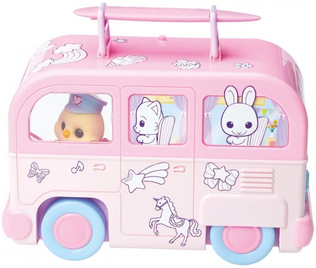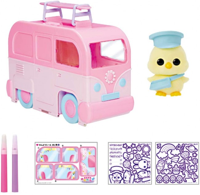 【セット内容】おかたづけバス(サーフボード付き)(1),ひよこ(ぼうしとポシェット付き)(1),細ペン(ピンク、パープル2色各1)(2),せんようシール まど用(1),