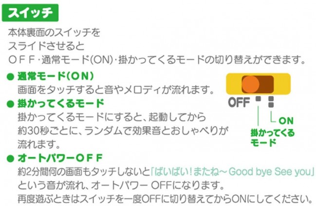 掛かってくるモードにすると、起動してから約30秒ごとに、ランダムで効果音とおしゃべりが流れます。