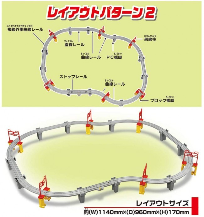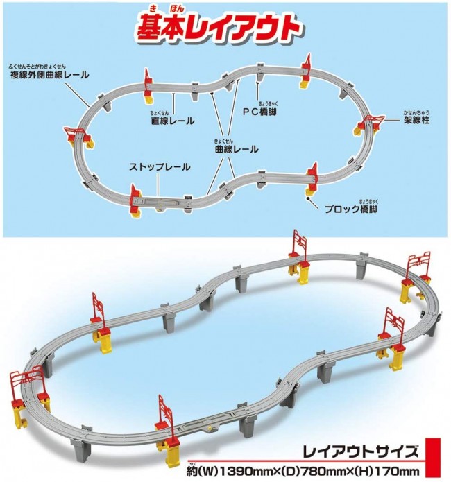 【セット内容】直線レール(3),ストップレール(1),曲線レール(4),複線外側曲線レール(8),ブロック橋脚(6),PC橋脚(10),架線柱(12)