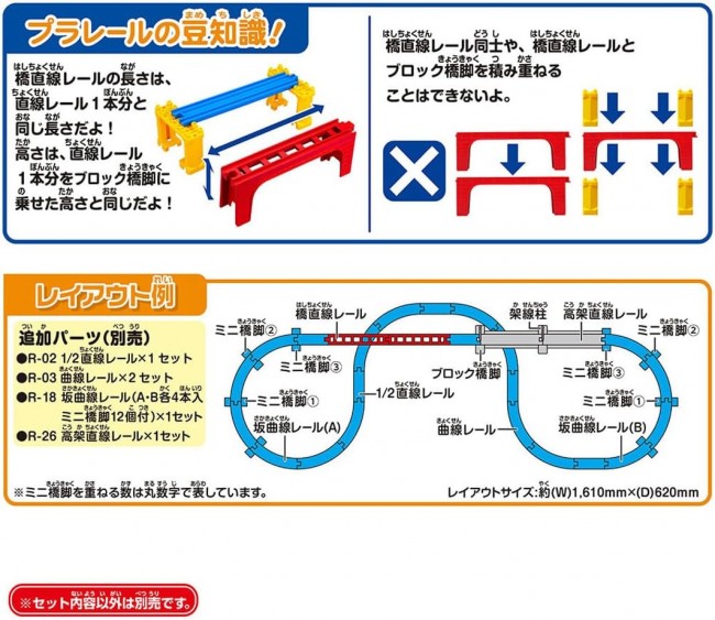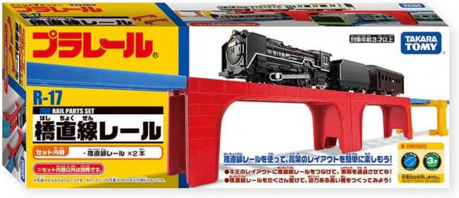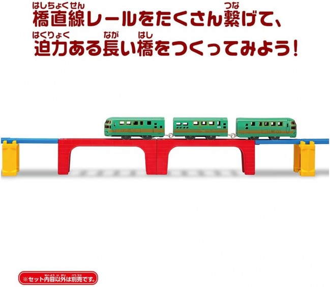 鉄道模型用 レイアウト用品・アクセサリーパーツ 直線レールと橋脚が一体になったレールで、 高架のレイアウトを簡単に楽しむことができるレールです。 直線レール1本分と同じ長さで、ブロック橋脚に直線レールを乗せた時と同じ高さのレールです。 橋脚と直線レールが一体になっているので、高架のレイアウトを簡単に作ることができます。 橋直線レールをたくさん繋げると、迫力ある長い橋をつくることができます。 ※橋直線レール同士を積み重ねることはできません。 ※橋直線レールとブロック橋脚を積み重ねることはできません。 パッケージサイズ: W260×H100×D50mm 対象年齢: 3歳~ 商品内容 橋直線レール(2) (C)TOMY (タカラトミーモールウェブサイトより)