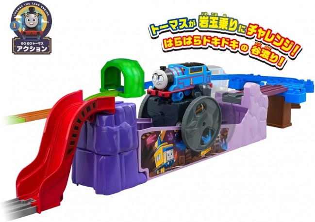 トーマスがゴロゴロ岩玉に乗って、はらはらドキドキの谷渡りをするよ! 線路の途中に大きな岩玉が!トーマスが岩玉乗りにチャレンジ!うまく谷を渡れるかな? GOGOミニ急坂を駆け下りたり、トンネルをくぐったり、他にもたのしいあそびがいっぱい! さまざまなアクションがたのしめる!GOGOトーマス(動力車)、レール部品、情景部品が入ったオールインワンセットです。 セット商品(別売)とつなげたり、トーマスのなかまたち(別売)をはしらせてあそぼう! 【セット内容】GOGOトーマス(動力車)(1),トンネル(1),S字レール(2),曲線レール(4),坂曲線レール(A)(4),坂曲線レール用橋脚(S)(1),坂曲線レール用橋脚(М)(1),坂曲線レール用橋脚(L)(1),1/2直線レール(2),ゴロゴロ岩玉(1),岩場(1),GOGOミニ急坂(1),玉乗りスロープ(1),旗(1),シール(1) (C) TOMY (C)2024 Gullane (Thomas) Limited. (C)2024 HIT Entertainment Limited. 単3形アルカリ乾電池1本使用(電池は別売です。)