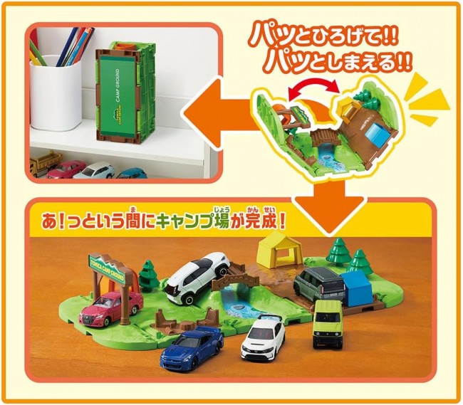 パッと開いてすぐ遊べるトミカタウンにキャンプ場が登場! いろいろな立体レイアウトをつくれるよ! キャンプ場がぴったりはまる、立体レイアウトがつくれるどうろとトミカタウンのセットです。 (1)立体・平面どちらでも取り付けられる「鉄橋」「ジョイントどうろ」つき (2)鉄橋やジョイントどうろを使って、立体交差もつくれちゃう! (3)くみかえかんたん! 色々な立体レイアウトがつくれるよ (4)人形2体付き 組み立て、ラベル貼り不要で本体をパッと開くとすぐに遊べます。 キャンプ場部分は遊ばないときは折りたたんでコンパクトに収納が可能です。 ※トミカ(ミニカー)は別売です。 【セット内容】キャンプ場(1),鉄橋(2),どうろ橋脚(3),坂どうろ(2),ジョイントどうろ(1),1/2どうろ(6),1/4どうろ(1),カーブどうろ(5),T字どうろ(1),人形(オレンジ)(1),人形(スカイブルー)(1) (C) TOMY