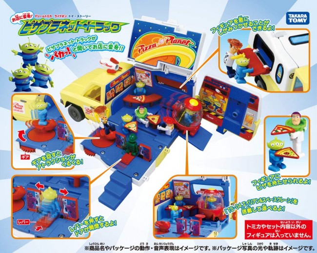 ピザ・プラネットトラックがピザショップへ変身する、ドリームトミカ ライドオン トイ・ストーリー単品と一緒に遊べるおもちゃです。