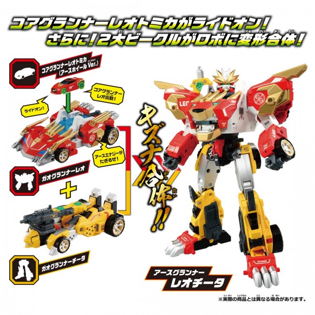 ・コアグランナーレオトミカをガオグランナーレオ(ビークル状態)に組み込むとガオグランナー対応のサウンドが鳴り、アースグランナーレオチータ(ロボ状態)に組み込むとアースグランナーレオチータ対応サウンドが鳴るぞ!