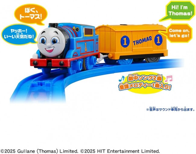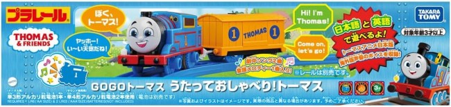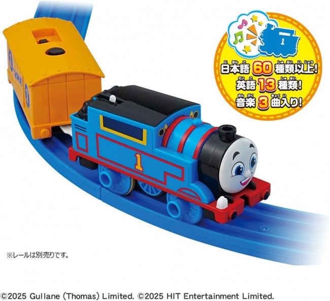 アニメ「きかんしゃトーマス」に登場するキャラクター、トーマスが日本語と英語でたくさんおしゃべり!音楽も流れるよ! ・「トーマス」の動力車です。プラレールのレールを走行して遊べます。 ・サウンド車両のトーキングボタンを押すと、モードが変わります。 ■日本語おしゃべりモード:元気にあいさつをしたり、仲間に話しかけたりします。日本語は60種類以上! ■英語おしゃべりモード:英語であいさつしたり、楽しく語りかけたりします。英語は13種類! ■音楽モード:アニメの劇中ソングを歌ったり、童謡メロディーが楽しめます。アニメ劇中ソング2曲、童謡メロディ1曲が収録! ・停車・発車の動きに合せておしゃべりするので、手転がし遊びや電動走行がさらに楽しくなります。 ・先頭車両だけでGOGOトーマスアクションセット(別売)といっしょに遊べます。 ・音声はサウンド車両から出ます。 ・レール、電池は別売です。 【セット内容】GOGOトーマス(動力車)(1),トーマスサウンド貨車(1) (C) TOMY (C)2025 Gullane (Thomas) Limited. (C)2025 HIT Entertainment Limited. 単3形アルカリ乾電池1本、単4形アルカリ乾電池2本使用(電池は別売です。)
