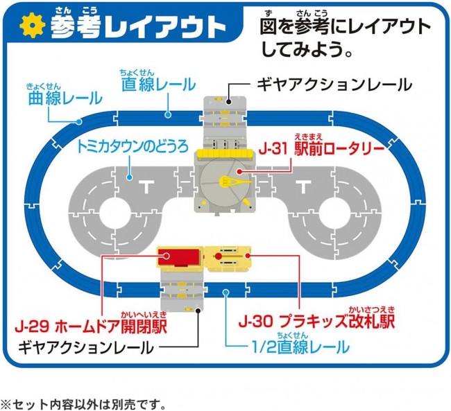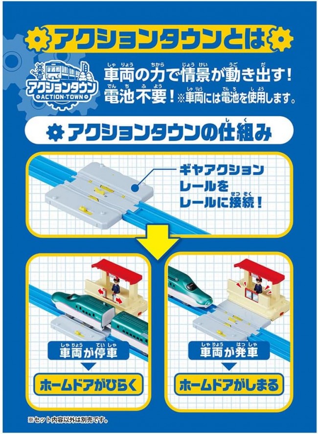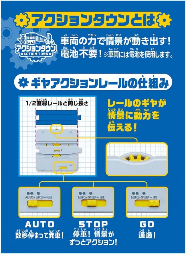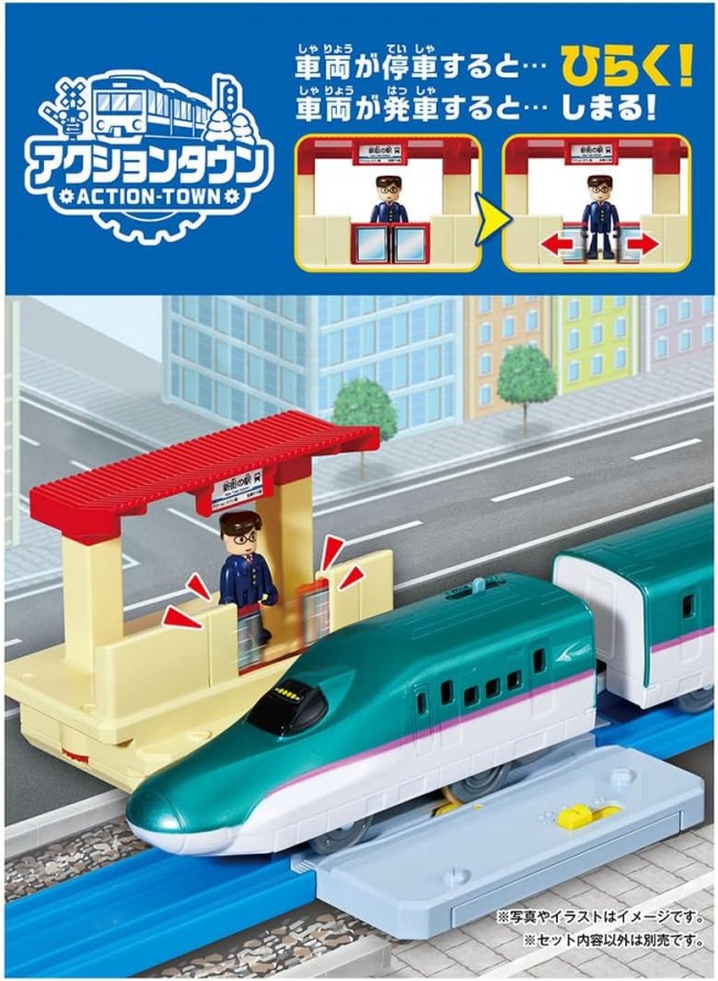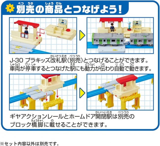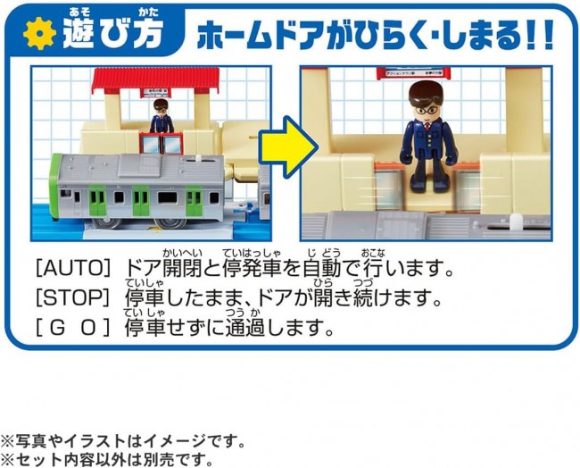 車両の力で情景が動き出す! アクションタウンのホームドア開閉駅が登場! 車両が駅に到着すると自動でホームドアが開く! 発車で閉まる! 付属のギヤアクションレールは1/2直線レールサイズでレイアウトも組みやすい! キミだけの動き出す街を作ろう! ギヤアクションレールはスイッチでAUTO、STOP、GOの3種類に切り替えができます。 AUTOでは車両が到着すると停車しホームドアが開きます。一定時間で車両は発車しホームドアが閉まります。 STOPでは停車したまま、ドアが開き続けます。(GOにすると発車し閉まります。) GOでは停車せず車両は通過します。 ■別売の「J-30 アクションタウン プラキッズ改札駅」とつなげることができ、車両が停車すると2つのアクションを一緒に遊べます。 ■ギヤアクションレールとホームドア開閉駅は別売のブロック橋脚に載せて遊ぶことができます。 ※ギヤアクションレール、ホームドア開閉駅の上にブロック橋脚を載せることはできません。 【セット内容】ホームドア開閉駅(1),屋根(1),ギヤアクションレール(1),シール(1),部品注文書(1) (C) TOMY