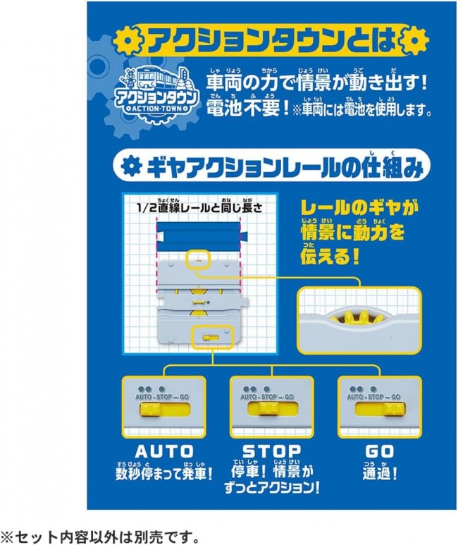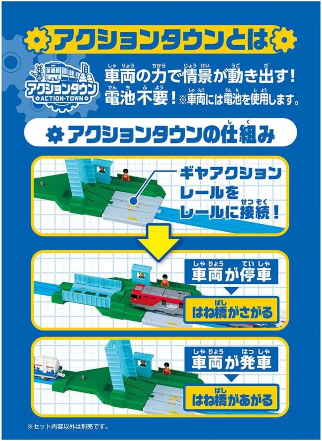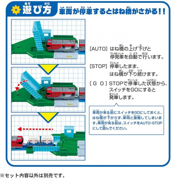 車両の力で情景が動き出す! アクションタウンの大きなはね橋が登場! 車両がはね橋に到着すると自動で橋がさがる! 通過後は自動であがる! 付属のギヤアクションレールは1/2直線レールサイズでレイアウトも組みやすい! キミだけの動き出す街を作ろう! ギヤアクションレールはスイッチでAUTO、STOP、GOの3種類に切り替えができます。 AUTOでは車両が到着すると停車しはね橋がさがります。はね橋がさがりきったあと、一定時間で車両は発車しはね橋も自動であがります。 STOPでは停車したままはね橋がさがり、その後GOにすると車両が発車しはね橋も自動であがる手動操作ができます。 ■作業所では別売のプラキッズと一緒に遊ぶことができます。 ■ギヤアクションレールと大きなはね橋は別売のブロック橋脚に載せて遊ぶことができます。 ※ギヤアクションレール、大きなはね橋の上にブロック橋脚を載せることはできません。 【セット内容】はね橋ベース(1),はね橋(1),作業所(1),ギヤアクションレール(1),部品注文書(1) (C) TOMY