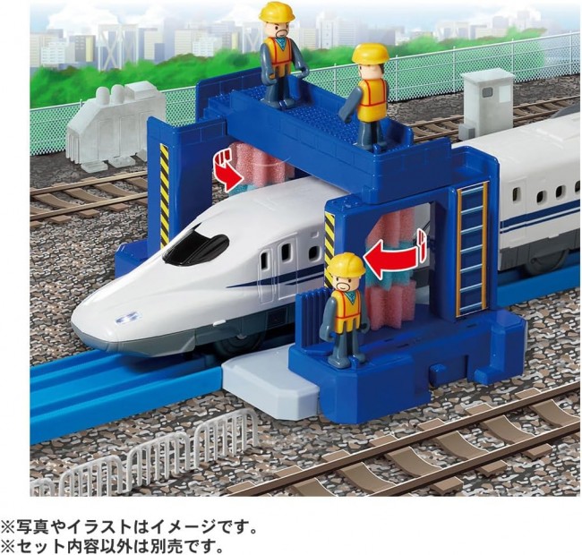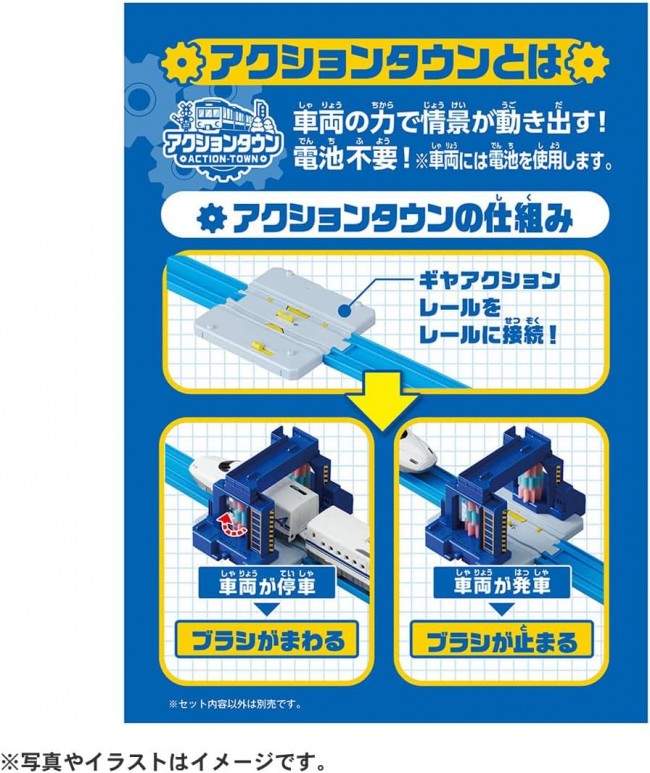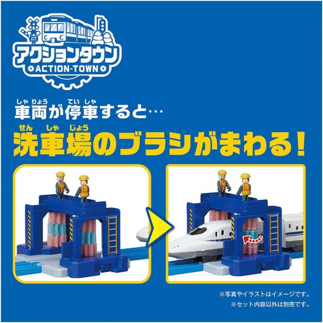 車両の力で情景が動き出す! アクションタウンのぐるぐる洗車場が登場! 車両が到着すると自動で洗車場のブラシがまわる! 付属のギヤアクションレールは1/2直線レールサイズでレイアウトも組みやすい! キミだけの動き出す街を作ろう! ギヤアクションレールはスイッチでAUTO、STOP、GOの3種類に切り替えができます。 AUTOでは車両が到着すると停車し洗車場のブラシがまわります。一定時間で車両は発車しブラシも止まります。 STOPでは停車したままブラシがまわり続けます。(GOにすると発車し止まります。) GOでは停車せず車両は通過します。 ■屋根などで別売のプラキッズと一緒に遊ぶことができます。 【セット内容】洗車機(1),洗車機 レバー付き(1),屋根(1),ギヤアクションレール(1),シール(1),部品注文書(1) (C) TOMY