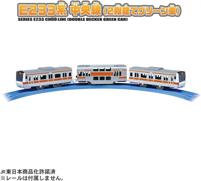 E233系は2006年から中央線快速・青梅線・五日市線などで運行を開始した車両です。 中間車は両開きドアが特徴の2階建てグリーン車を再現しています。 プラキッズが1体付属し、中間車に乗せて遊ぶことができます。 ■「E233系中央線(2階建てグリーン車)」がモデル ■3両編成でそれぞれ連結・切り離し可能 ■1スピードで電動走行、スイッチOFFで手転がし遊び可能 ■プラキッズ1体付 ■中間車はプラキッズ乗車遊びが可能 ■プラ列車カード付 ※レールは付属しません。 【セット内容】車両本体(1),プラキッズ(1),プラ列車カード(1),部品注文書(1) (C) TOMY JR東日本商品化許諾済 単3形乾電池1本使用(電池は別売です。) ※誤飲防止のため、電池ケース蓋に「ネジ止め式」を採用しています。