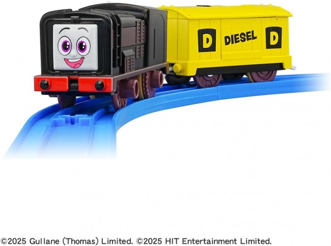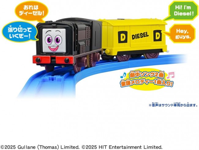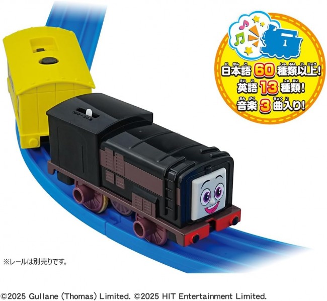 アニメ「きかんしゃトーマス」に登場するキャラクター、ディーゼルが日本語と英語でたくさんおしゃべり!音楽も流れるよ! ・「ディーゼル」の動力車です。プラレールのレールを走行して遊べます。 ・サウンド車両のトーキングボタンを押すと、モードが変わります。 ■日本語おしゃべりモード:元気にあいさつをしたり、仲間に話しかけたりします。日本語は60種類以上! ■英語おしゃべりモード:英語であいさつしたり、楽しく語りかけたりします。英語は13種類! ■音楽モード:アニメの劇中ソングを歌ったり、童謡メロディーが楽しめます。アニメ劇中ソング2曲、童謡メロディ1曲が収録! ・停車・発車の動きに合せておしゃべりするので、手転がし遊びや電動走行がさらに楽しくなります。 ・先頭車両だけでGOGOトーマスアクションセット(別売)といっしょに遊べます。 ・音声はサウンド車両から出ます。 ・レール、電池は別売です。 【セット内容】GOGOディーゼル(動力車)(1),ディーゼルサウンド貨車(1) (C) TOMY (C)2025 Gullane (Thomas) Limited. (C)2025 HIT Entertainment Limited. 単3形アルカリ乾電池1本、単4形アルカリ乾電池2本使用(電池は別売です。)