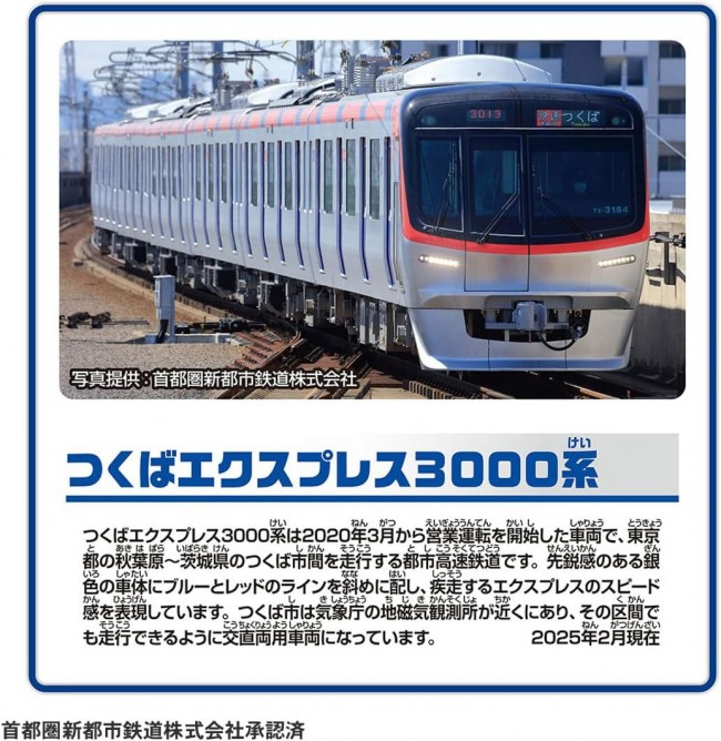 つくばエクスプレス3000系がプラレールに登場です。 つくばエクスプレスは東京都の秋葉原~茨城県のつくば市間を走行する都市高速鉄道で、3000系は2020年3月から営業運転を開始した車両です。 先鋭感のある銀色の車体にブルーとレッドのラインを斜めに配し、疾走するエクスプレスのスピード感を表現しています。 ■「つくばエクスプレス3000系」がモデル ■3両編成で連結・切り離し可能 ■1スピードで電動走行、スイッチOFFで手転がし遊びが可能 ■プラ列車カード付 ※レールは付属しません。 【セット内容】車両本体(1),部品注文書(1),プラ列車カード(1) (C) TOMY 首都圏新都市鉄道株式会社承認済 単3形乾電池1本使用(電池は別売です。)