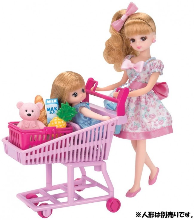 リカちゃんが押して遊べるショッピングカートです。 ミキちゃんかマキちゃんの一人を乗せられます。