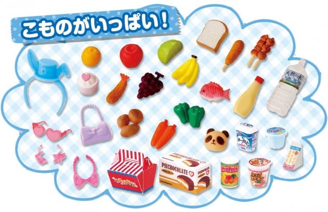 棚(2)、床 (2)、エスカレーター(1)、柱(2)、レジ(1)、エスカレードールスタンド(1)、ブルー棚(なみなみ)(1)、ブルー棚(丸)(1)、棚大 (5)、棚小(2)、フック(2)、フック付トレイ(2)、カゴ(2)、ハンガー(4)、ハンガーかけ(2)、食材小物(21)、食材小物(ランナー)(1)、手すり(4)、ドレスホルダー(1)、トング(1)、おしゃれ小物(5)、ボード(3)、ラベル、ミラーラベル(2)、紙小物(1)、買い物バッグ(1)
