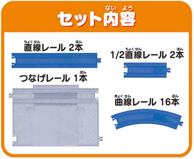 【セット内容】1/2直線レール(2),曲線レール(16),直線レール(2),つなげレール(1)