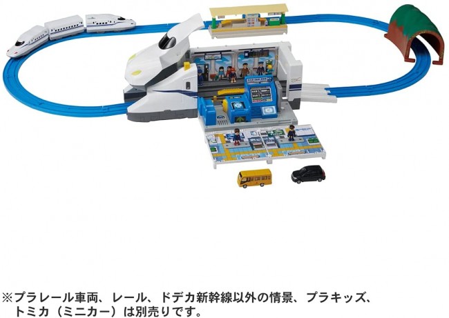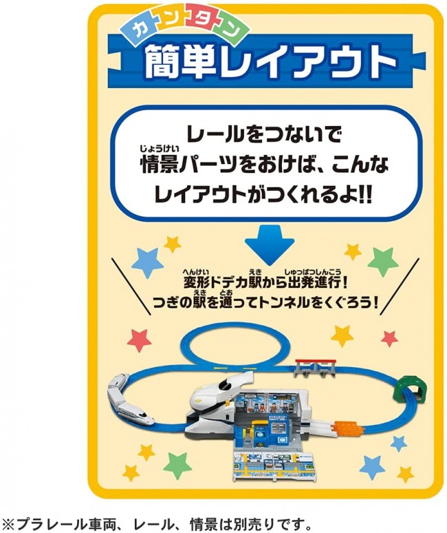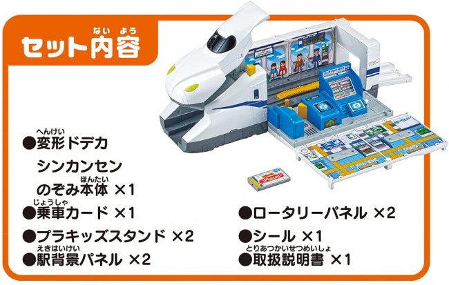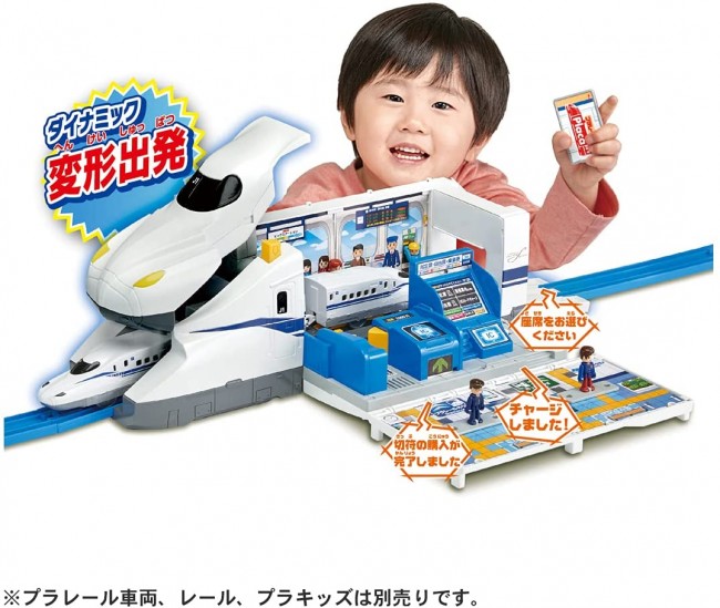 大きな新幹線N700Sが遊びがいっぱいの駅に変形! ■大人気の新幹線N700Sが全長約45cmのビッグサイズでプラレールに登場! ■新幹線から遊びがいっぱいの駅に簡単ダイナミック変形! ■変形後の「ステーションフォーム」では沢山の駅遊び! 改札や券売機を付属の「乗車カード」でタッチすると、駅でおなじみの楽しいサウンドが再生!そのサウンドパターン80種類以上! ■オートモードにすると、付属の「乗車カード」のタッチで大迫力の自動変形&自動発車! ■マニュアルモードでは、手動で好きな車両の停車と発車遊びも楽しめます! ■簡単なレイアウトで遊べるので、プラレールをはじめたばかりのお子様にもおすすめです! ■「新幹線フォーム」では手転がし遊びも楽しめます! 【セット内容】変形ドデカシンカンセンのぞみ本体(1),乗車カード(1),プラキッズスタンド(2),駅背景パネル(2),ロータリーパネル(2),シール(1),取扱説明書(1) (c) TOMY JR東海承認済 単4形アルカリ乾電池3本使用(電池は別売です。) ※電池はアルカリ乾電池をご使用ください。 ※誤飲防止のため、電池ケース蓋に「ネジ止め式」を採用しています。