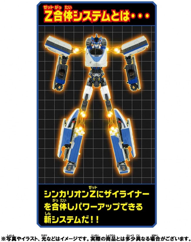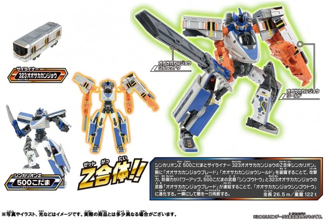 テレビアニメ「新幹線変形ロボシンカリオンZ」から『シンカリオンZ500こだま』と『ザイライナー323オオサカカンジョウ』がセットになってプラレールで登場! ■シンカリオンZ500こだま3両編成仕様で、新幹線からロボットに変形! ■ザイライナー323オオサカカンジョウ1両編成仕様で在来線からウエポンモードに変形! さらに!『シンカリオンZ500こだま』と『ザイライナー323オオサカカンジョウ』が「Z合体」! 『シンカリオンZ500オオサカカンジョウ』へとパワーアップできる、スペシャルセット! ※レール、電動走行車両は入っていません。 【セット内容】シンカリオンZ 500こだま(3両編成)(1),ザイライナー 323オオサカカンジョウ(1),武器(1),取扱説明書(1),ラベル(1) (c) TOMY (c)プロジェクト シンカリオン・JR-HECWK/超進化研究所Z・TX