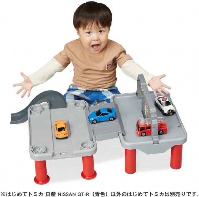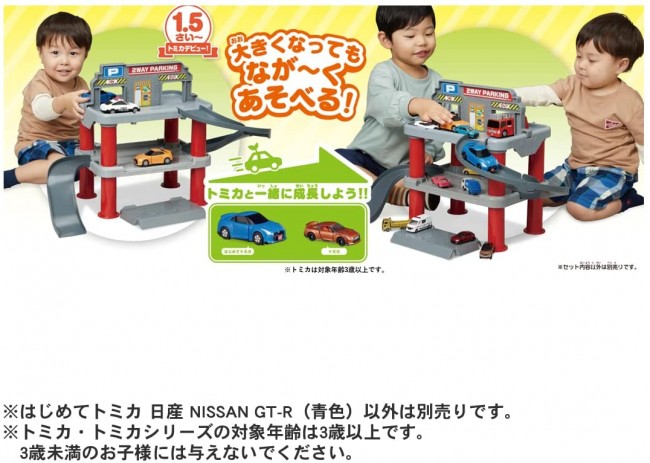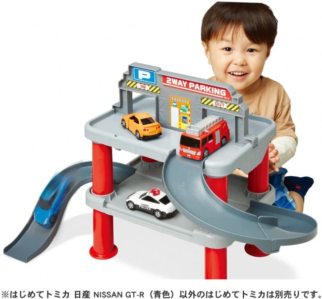 1.5才から楽しく安全に遊べるはじめてトミカシリーズと一緒にあそべる駐車場が登場! (1)立体モード、ひろびろモードの2WAYで遊べます。 (2)特別カラーのはじめてトミカ「日産NISSAN GT-R」1台付き。 「日産NISSAN GT-R」はドアが開閉する楽しいアクション付き。 (3)立体モードは、はじめてトミカを屋上から一気に走らせるダイナミックなスロープ遊びができます。 (4)手ころがしでひろびろパーキング遊びができます。 (5)スロープを外してパーキングプレートをはめると、すっきりコンパクトになります。 (6)大きくなったら、トミカ(対象年齢3才以上~)でも遊べます。 【セット内容】パーキングフロア(屋上)(1),パーキングフロア(2階)(1),パーキングプレート(1),屋上ゲート(1),スロープA(1),スロープB(1),スロープC(1),柱(2階)(4),柱(1階)(4),はじめてトミカ 日産 NISSAN GT-R(1),シール(1) (c) TOMY