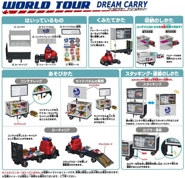 世界旅行“ワールドツアー”をテーマにしたディズニーモータースが登場です! ・ディズニーモータースを8台運ぶことができるキャリーです。 ・世界旅行をテーマにした『ワールドツアー』のモータースロゴがポイントです。 ・まるでスーツケースのような雰囲気のコンテナには、付属の専用シールを貼ってデコレーションができます! ・コンテナにしまったモータースをいつでも眺めることができるので、キャリーの可愛らしさとモータースの可愛らしさの両方を楽しむことができます。 ・同じワールドツアーロゴを施したミニカー(別売り)4台が同時発売です。 【セット内容】トレーラーヘッド(1),カーキャリア(1),コンテナ(1),専用シール(1) (c) Disney
