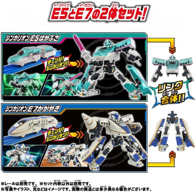 ■シンカリオンに変形! 2両編成の新幹線からロボットに変形! ■カッコイイ!ポージングが可能! 進化した可動域により、劇中さながらのポージングやアクション再現が可能に! ■シンカリオン同士が合体! シンカリオン2体が合体する「リンク合体」が可能! 「シンカリオン E5+E7」「シンカリオン E7+E5」の2パターンのリンク合体が楽しめる! (C) TOMY (C)プロジェクト シンカリオン・JR-HECWK/超進化研究所・TBS