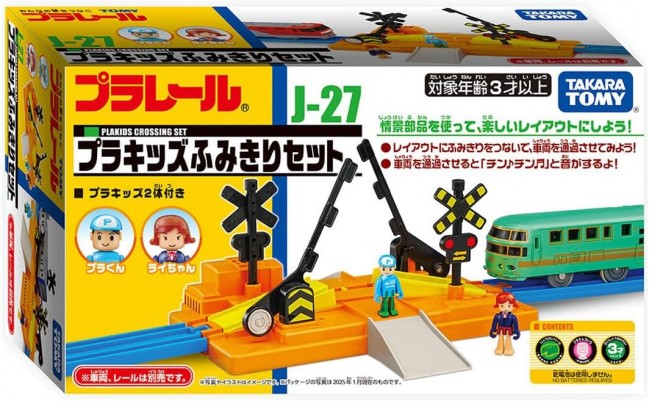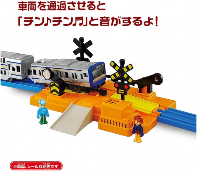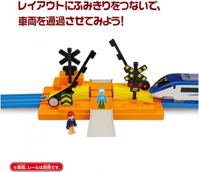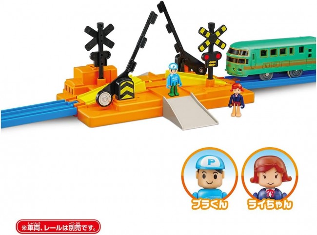 車両が通ると遮断かんがおりて、「チン♪チン♪」と音が鳴るふみきりセットだよ! レイアウトにふみきりをつないで、車両を通過させてみよう! ■車両が通ると遮断かんがおりて、「チン♪チン♪」と音が鳴るふみきりセットです。 ■付属のプラキッズと一緒に遊べます。 ■プラキッズ(プラくん・ライちゃん)2体付きです。 【セット内容】ふみきり本体(1),警報機(2),スロープ(2),プラキッズ(プラくん、ライちゃん)(2),シール(1),部品注文書(1) (C) TOMY