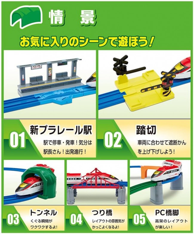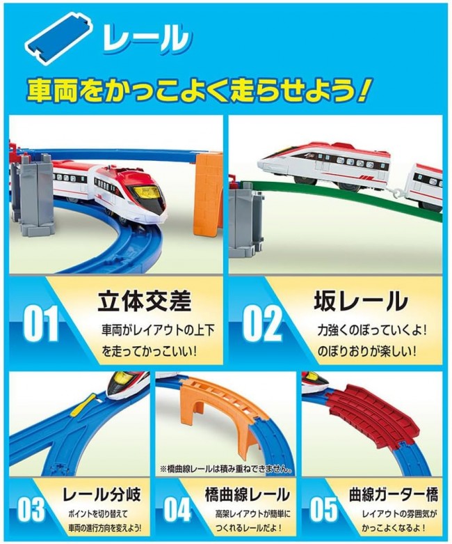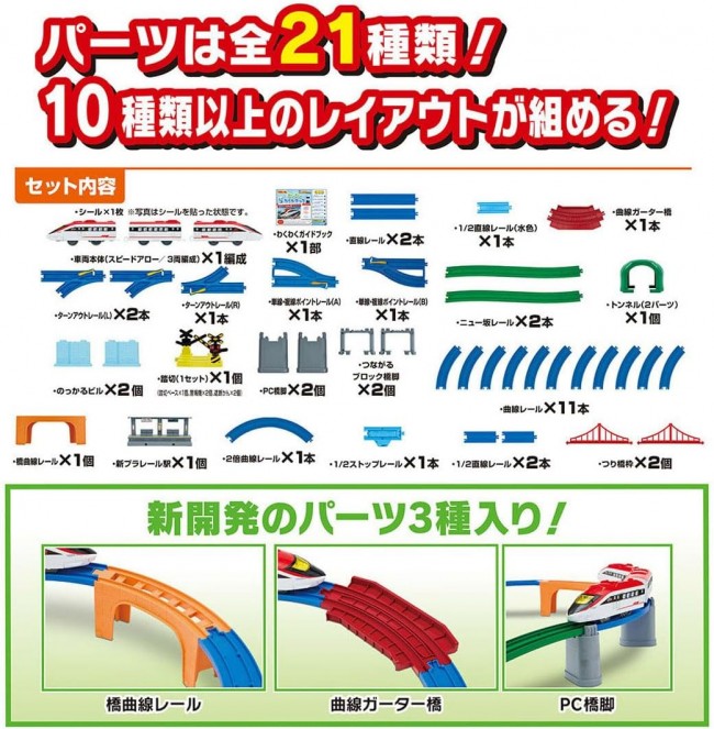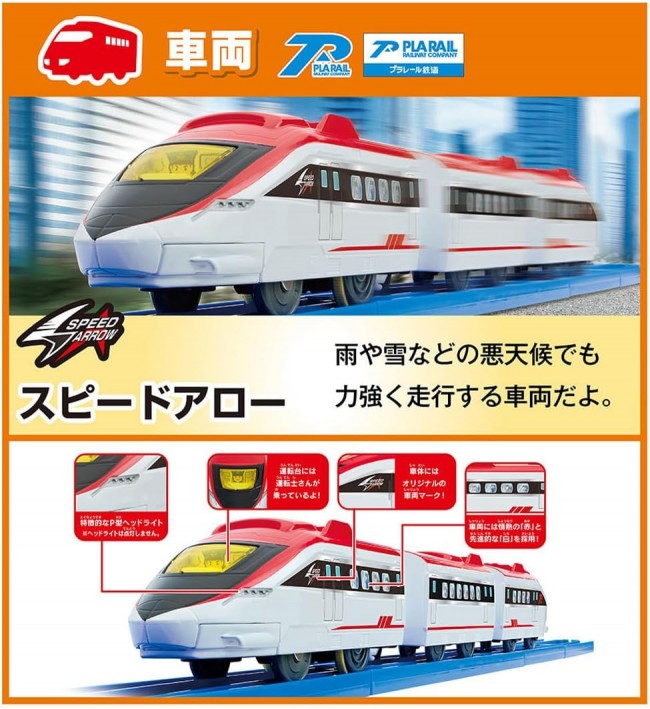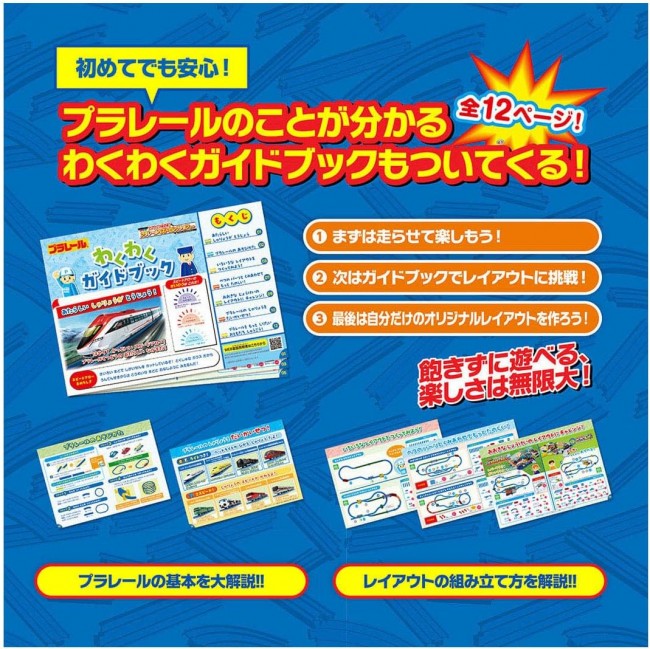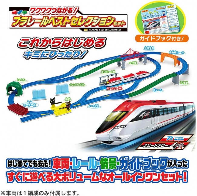 これからはじめるキミにぴったり! すぐに遊べる「車両」「レール」「情景」「ガイドブック」がそろったオールインワンセット! オリジナル新車両や新パーツも入って、10種類以上のレイアウトが作れる大ボリュームなセットです。 オリジナル新車両「スピードアロー」や、高架が簡単に作れる「橋曲線レール」「PC橋脚」をはじめ、「駅」「踏切」「つり橋」「曲線ガーター橋」「トンネル」まで入った、すぐに遊べるオールインワンセットです。 さらに!「わくわくガイドブック」付きだから、これからプラレールで遊ぶお子様でも安心! レイアウトの組み立て方だけでなく、プラレールの遊び方から人気の車両図鑑まで、プラレールのことがまるわかり! パーツは全21種類! このセットだけで、10種類以上のレイアウトを組むことができる大ボリュームな商品です。 ■車両はオリジナルの高速車両「スピードアロー」です。 ■「橋曲線レール」は直線レールとブロック橋脚がひとつになった、高架を簡単につくれるレールです。 ■「PC橋脚」はツメが付いているので、レールをしっかり支えます。PC橋脚を積み重ねることもできます。 ■「曲線ガーター橋」は床面に直接置くだけでなく、橋脚の上に設置することもできます。 ■「のっかるビル」はビルの情景として使えるほか、レールを載せて橋脚としても使うことができます。 ■「つながるブロック橋脚」は2つに分割できて、それぞれを1つの橋脚として使うこともできます。 【セット内容】車両本体(スピードアロー/3両編成)(1),直線レール(2),1/2直線レール(2),1/2直線レール(水色)(1),曲線レール(11),2倍曲線レール(1),単線・複線ポイントレール(A)(1),単線・複線ポイントレール(B)(1),ターンアウトレール(L)(2),ターンアウトレール(R)(1),1/2ストップレール(1),ニュー坂レール(2),橋曲線レール(1),曲線ガーター橋(1),踏切(1セット)(1),トンネル(2パーツ)(1),のっかるビル(2),PC橋脚(2),つながるブロック橋脚(2),つり橋枠(2),新プラレール駅(1),シール(1),わくわくガイドブック(1),部品注文書(1) (C) TOMY 単3形乾電池1本使用(電池は別売です。) ※誤飲防止のため、電池ケース蓋に「ネジ止め式」を採用しています。