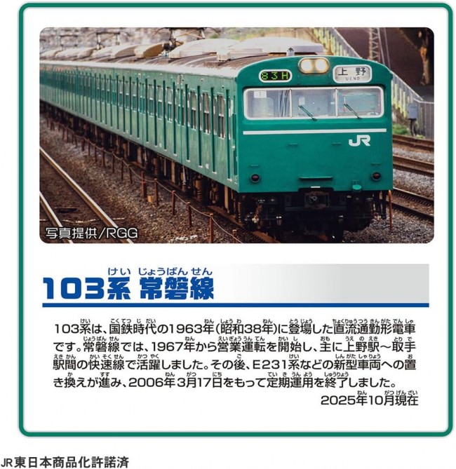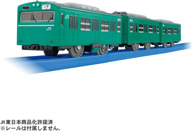 103系は国鉄時代の1963年(昭和38年)に登場した直流通勤形電車です。 常磐線では1967年から営業運転を開始し、主に上野駅?取手駅間の快速線で活躍しました。 その後E231系などの新型車両への置き換えが進み、2006年3月17日をもって定期運用を終了しました。 ■「103系常磐線」がモデル ■3両編成で連結・切り離し可能 ■1スピードで電動走行、スイッチOFFで手転がし遊びが可能 ■プラ列車カード付 ※レールは付属しません。 【セット内容】車両本体(1),プラ列車カード(1),部品注文書(1) (C) TOMY JR東日本商品化許諾済 単2形乾電池1本使用(電池は別売です。)
