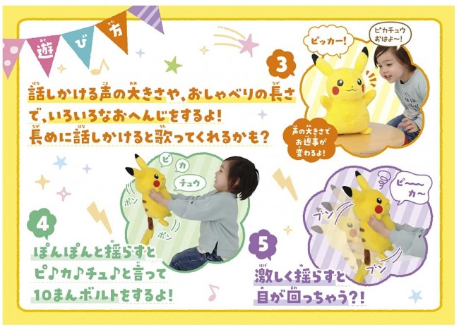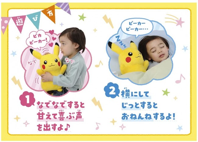 お世話アクションがたっぷり詰まったピカチュウのおしゃべりぬいぐるみが登場! 話しかけたり、なでたりすると色んなリアクションをしてくれる ■遊び方 (1)頭をなでると甘えて喜ぶ声を出すよ! 優しくなでなでしてあげよう(2)横にしてじっとするとおねんねするよ! 横で一緒にお昼寝しよう(3)話しかける声の大きさや、おしゃべりの長さで、いろんなお返事をするよ! 長めに話しかけると歌ってくれるかも!?いっぱい話しかけてあげよう(4)ぽんぽんと揺らすとピ・カ・チュと言って10まんボルトをするよ! 優しく揺らしてね!激しく揺らすと目が回っちゃうよ!? 【セット内容】ぬいぐるみ本体(1),おしゃべりBOX(1) (c)Nintendo・Creatures・GAME FREAK・TV Tokyo・ShoPro・JR Kikaku (c)Pokemon 単4形アルカリ乾電池3本使用(電池は別売です。)