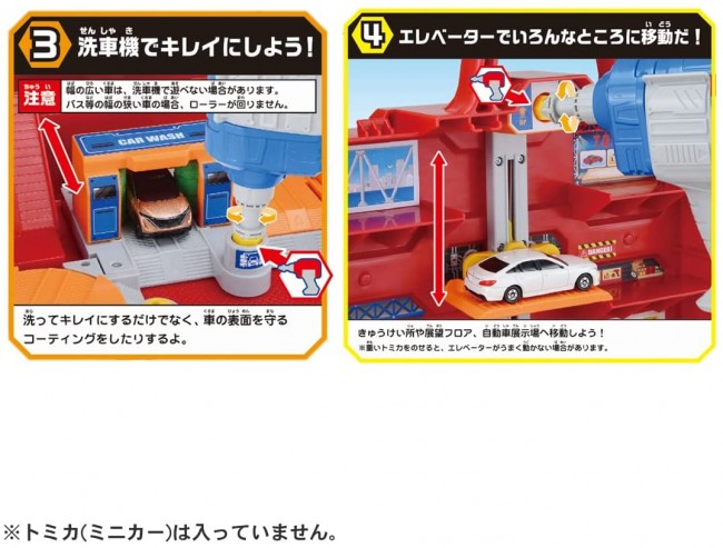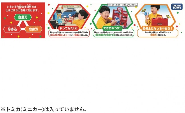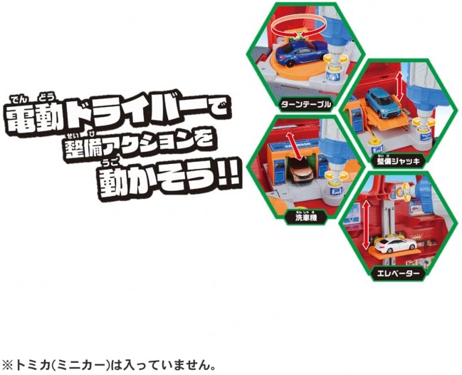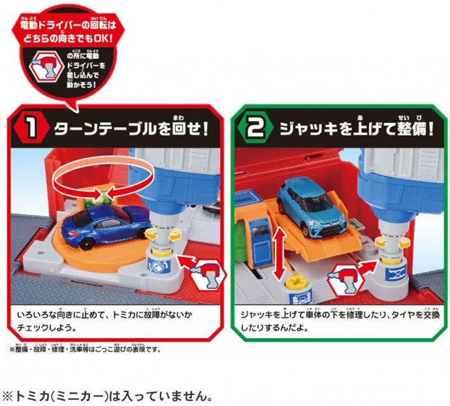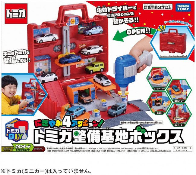 トミカDIYシリーズに第2弾が登場! 電動ドライバーでキミのトミカを整備して遊ぼう! ・付属の電動ドライバーを使って「ターンテーブル」、「電動ジャッキ」、「洗車機」、「エレベーター」の4つの整備アクションを動かして整備士ごっこ遊びが楽しめます。 ・本商品は遊びを通して「好奇心」、「理解力」、「想像力」を育む手助けになります。 ・整備基地ボックスで遊んだ後はツールボックスに変形させてコンパクトにお片付けができます。 ※トミカ(ミニカー)は付属しません。 ※整備、故障、修理、洗車などはごっこ遊びの表現です。 【セット内容】ボックス本体(1),電動ドライバー本体(1),持ち手(1),ビット(1),エレベーターゆか(1),スロープ(1),ラベル(1) 単3形アルカリ乾電池2本使用(電池は別売です。) ※誤飲防止のため、電池ケース蓋に「ネジ止め式」を採用しています。 ※乾電池は、アルカリ/マンガンどちらでも使用できます。 (c) TOMY