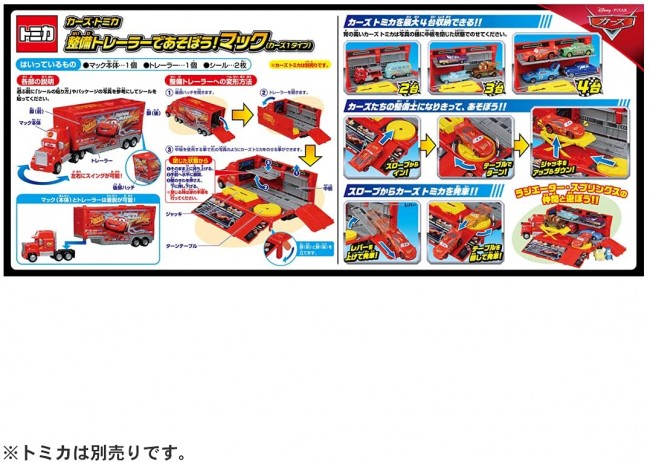 あそびがいっぱい!マックが整備トレーラーに変形!! マック本体と、カーズ トミカを載せて遊ぶことのできるトレーラーです。 ※カーズ トミカは別売りです。 トレーラー内のジャッキアップや、ターンテーブルを使用した整備遊びや、トレーラー後部からハンドシューターでトミカのスロープ発車を楽しめます。 マック本体とトレーラーは着脱可能で、手転がしで走らせることが出来ます。 【セット内容】本体(1),トレーラー(1),シール(2), ※カーズ トミカは別売りです。 (c) Disney/Pixar;PorscheTM;Hudson HornetTM;ChevroletTM;Plymouth SuperbirdTM,PettyTM;FIATTM;(c)Volkswagen AG;MackTM